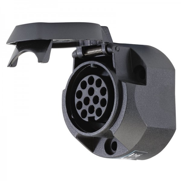 12V 13-pin Euro towing socket, fitted with sprung loaded cover. Weatherproof sprung socket cover protects the connections when not in use and locks the 13-pin plug when in use.