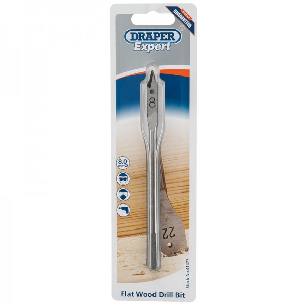 Flat wood drill bits manufactured from hardened and tempered carbon steel. Display packed.