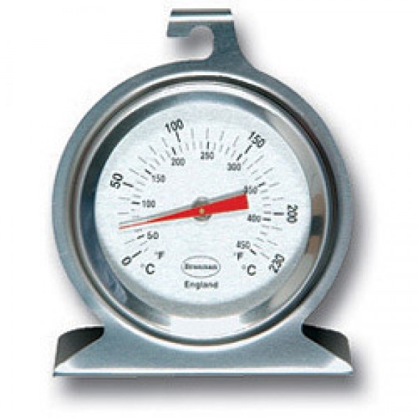 50mm stainless steel dial oven thermometer with black temperature scale. Suitable for hanging or sitting on oven shelf