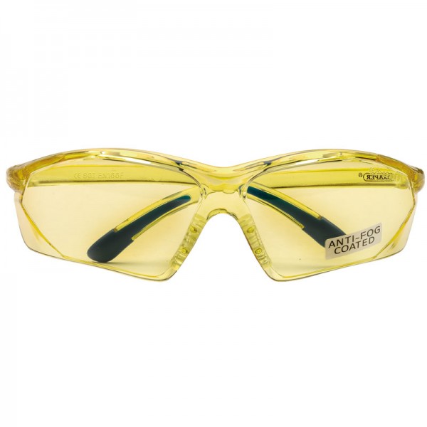 Lightweight safety glasses with yellow tint polycarbonate anti-scratch and anti-fog lenses. The yellow tinted lenses are perfectly suited for working in bright conditions, favoured by painters and decorators when painting white walls. Fitted with a soft rubber nose piece and rubber-tipped arms achieving a secure and comfortable fit.