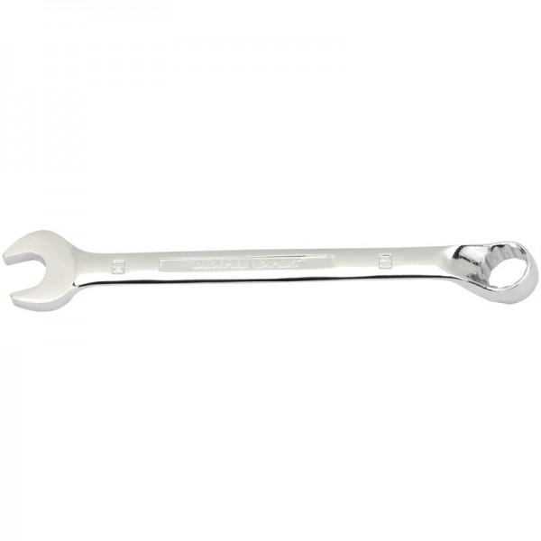 Expert Quality, with Draper Expert HI-TORQ® deep offset ring end cranked at 15°. Open end set at 15°. Long pattern forged from chrome vanadium steel, hardened, tempered, chrome plated and fully polished throughout.