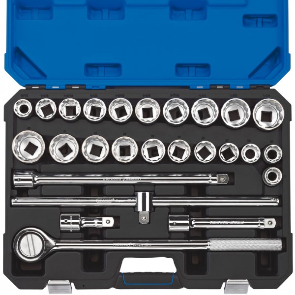 Expert Quality, twelve point socket made from chrome vanadium steel that’s hardened and tempered with a polished finish. Supplied with a reversible ratchet and accessories. Packed in a tough plastic storage case with soft grip handle.