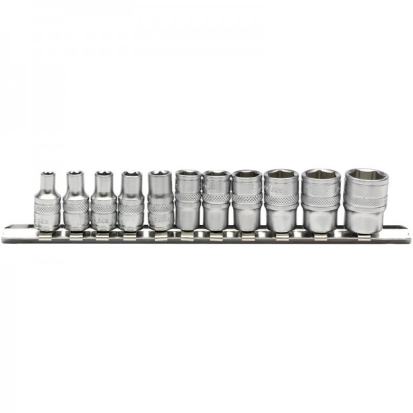 Expert Quality, 6 point socket manufactured from chrome vanadium steel, hardened and tempered with a micro satin finish. Each socket has a knurled ring for extra grip. Supplied on a metal socket rail for secure storage.