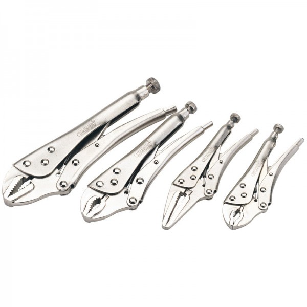 Four piece set with jaws manufactured from good quality steel hardened and tempered. Serrated gripping surfaces and adjustable opening with quick release lever. Display packed.