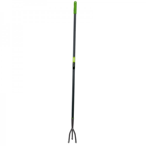 Three prong head with epoxy coated finish. Head securely fixed to tubular steel handle. With black plastic hand grip with hang hole. Sold loose.