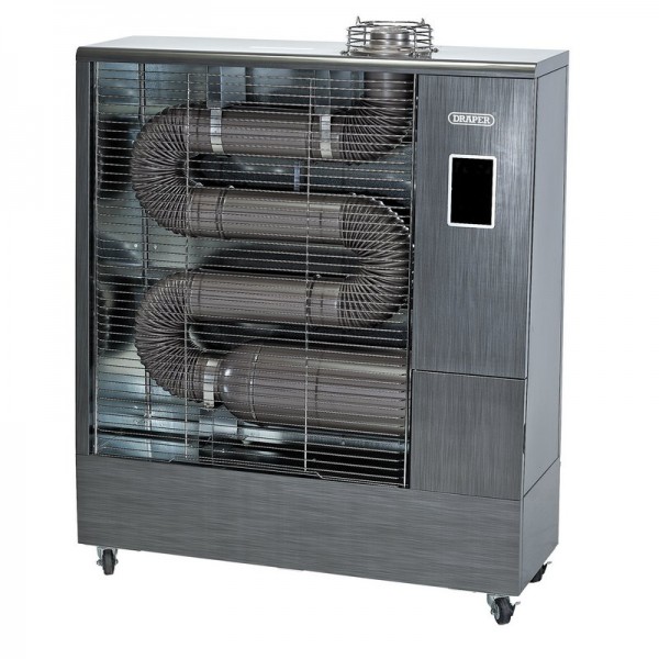 This indirect far infrared diesel heater with flue kit features a remote control and digital thermostat for easy heat control. It is economical, low noise, almost completely odourless and highly cost efficient to run. This heater consumes only 50W of electricity to keep the burner operating and it consumes as little as 1.2 litres of diesel fuel per hour. Unlike traditional fan heaters, infrared heat spreads evenly in all directions. Designed for heating spaces of approximately 85m2. Can be used in well-ventilated areas such as garages, barns, workshops, warehouses and marquees. The flue kit supplied allows for a more permanent installation and must be used for enclosed indoor areas (not well-ventilated). The LED control panel features a 24-hour timer and full thermostatic control, all conveniently operated by the remote control. It is fitted with wheels for manoeuvrability.